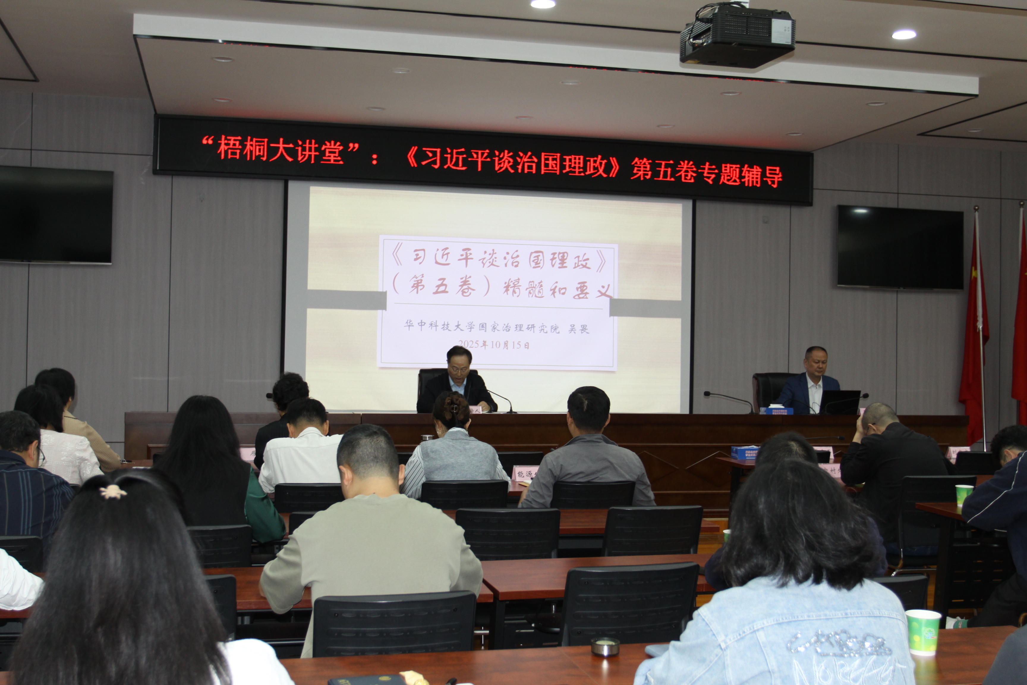 10月15日,我局开展“梧桐大讲堂”,邀请华中科技大学国家治理研究院吴畏副院长做《习近平谈治国理政》第五卷专题辅导报告,全局干部职工参加。